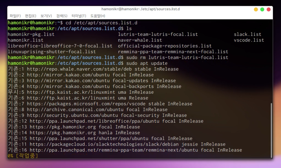 저장소 리스트 정보 파일을 제거 해주어야 합니다.