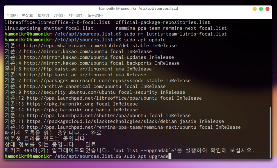 다음과 같이 업데이트과 완료되었다면 업그레이드 명령어를 입력합니다.
