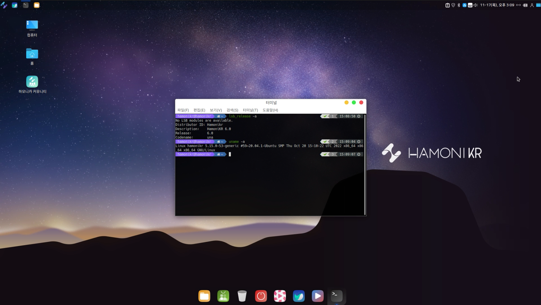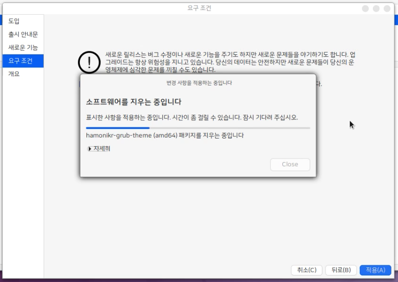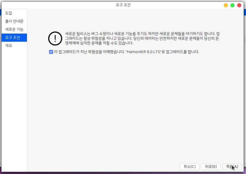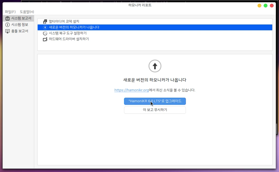 다음과 같은 창이 생겼다면 "HamoniKR 6.0 LTS"로 업그레이드를 클릭합니다.