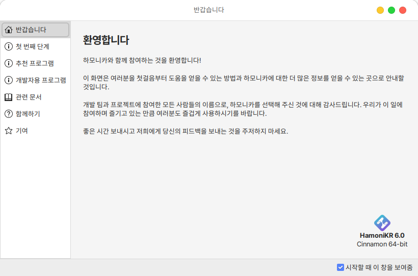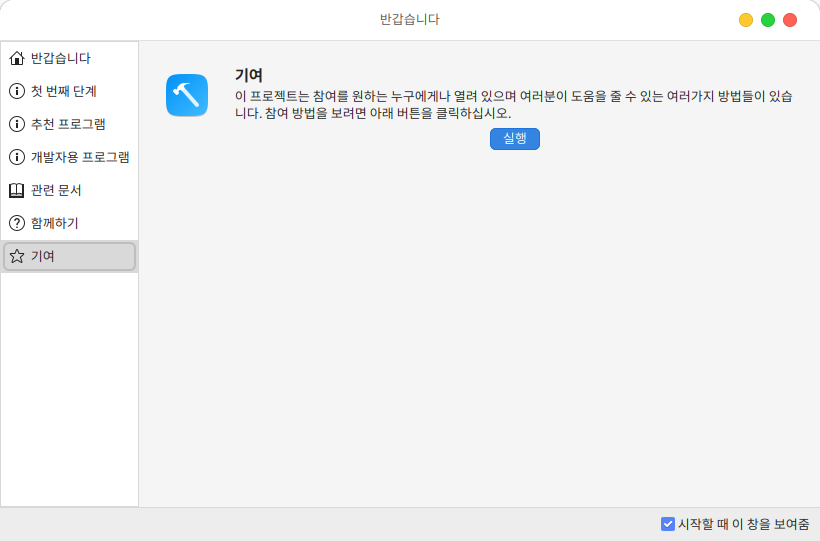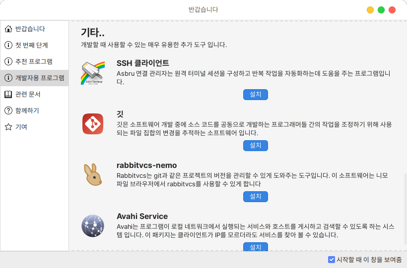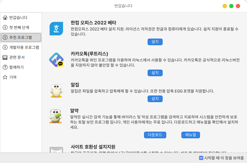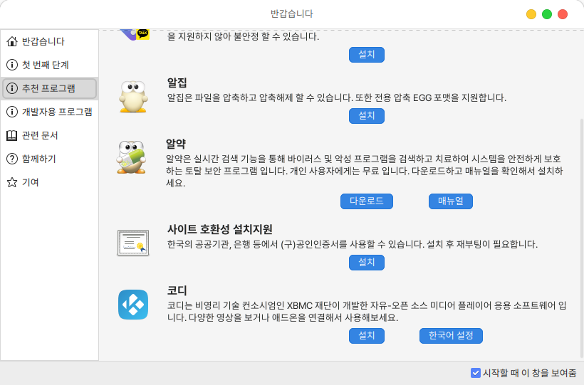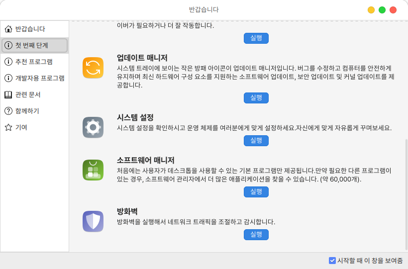환영합니다 프로그램을 통해 시스템 설정 및 추천 프로그램 설치, 관련 문서 확인 등의 기능들을 편리하게 실행할 수 있습니다.