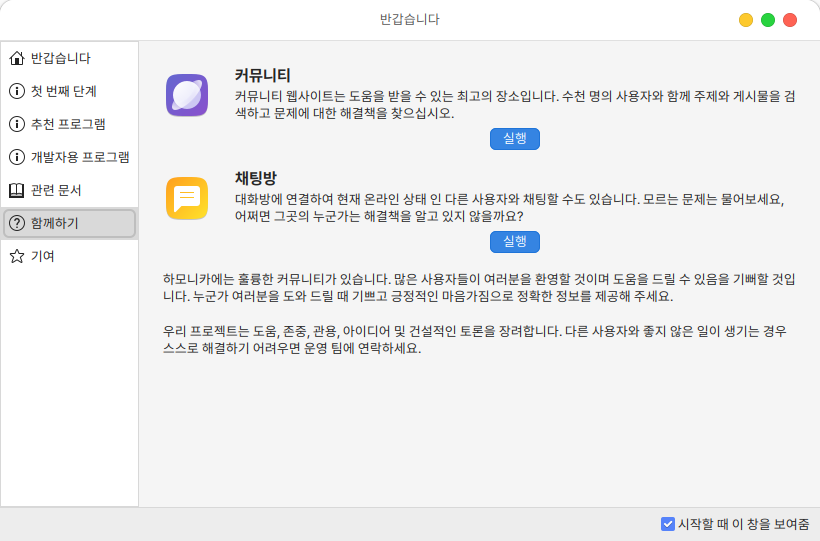 함께하기에서는 커뮤니티 홈페이지와 채팅 프로그램인 slack을 실행할 수 있습니다.