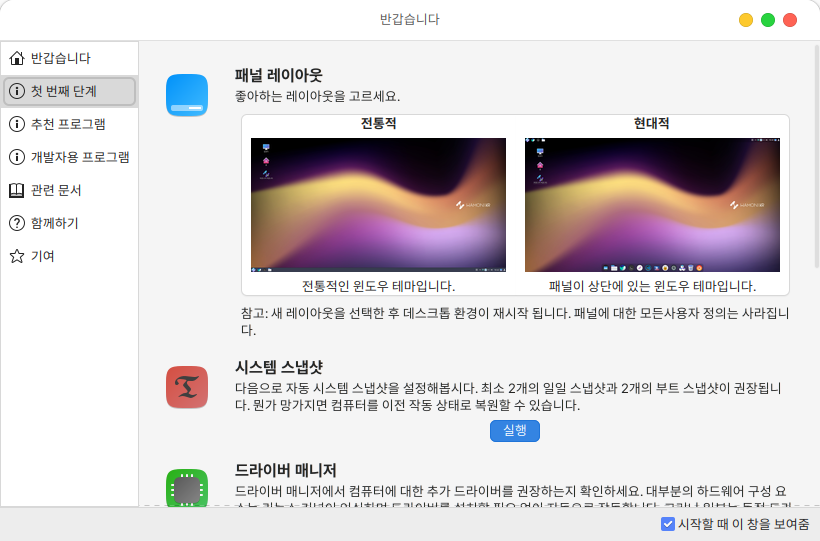 사이드바의 첫 번째 단계에서는 레이아웃 선택, 시스템 스냅샷, 드라이버 매니저, 업데이트 매니저, 시스템 설정, 소프트웨어 매니저, 방화벽 프로그램 실행이 가능합니다.