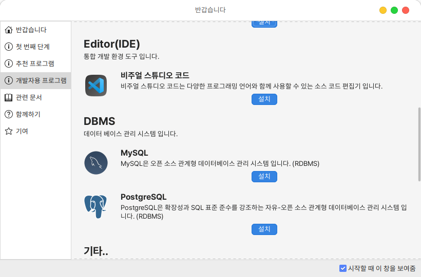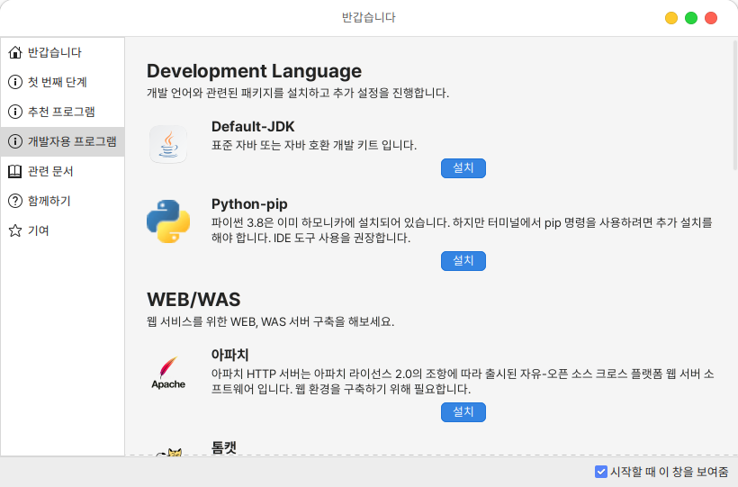 개발자용 프로그램에서는 개발에 필요한 언어, WEB/WAS, 에디터, 데이터베이스 관리 프로그램 설치가 가능합니다.