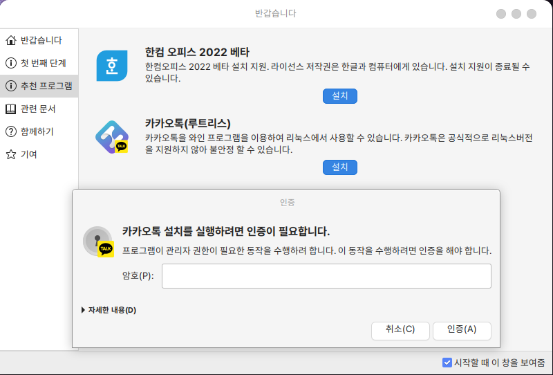 프로그램 하단의 설치 버튼을 클릭한 후 로그인한 계정의 비밀번호를 입력하면 설치가 진행됩니다.