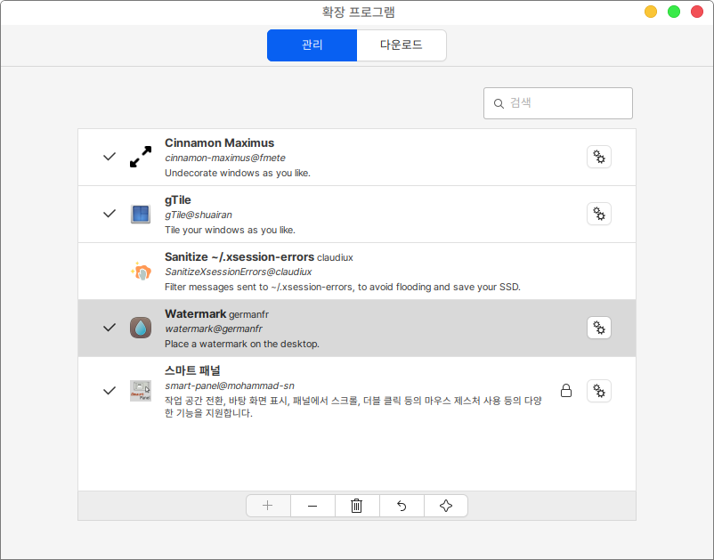 2\. 관리 메뉴에서 다운로드 받아진 확장 프로그램을 선택하고 하단의 + 버튼을 통해 확장 프로그램을 설치할 수 있습니다. (제거하고싶은 확장 프로그램은 선택 후 - 아이콘을 클릭합니다.)&#x20;
