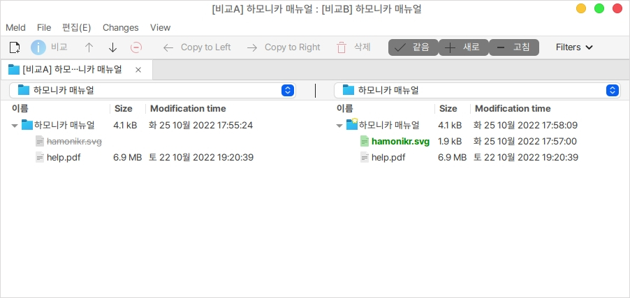 내용을 확인할 수 있는 파일의 경우에는 더블 클릭하여 파일 비교의 기능을 사용할 수 있습니다.