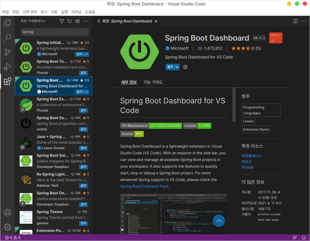 검색을 통해 원하는 개발 환경과 다양한 확장 기능을 추가할 수 있습니다.