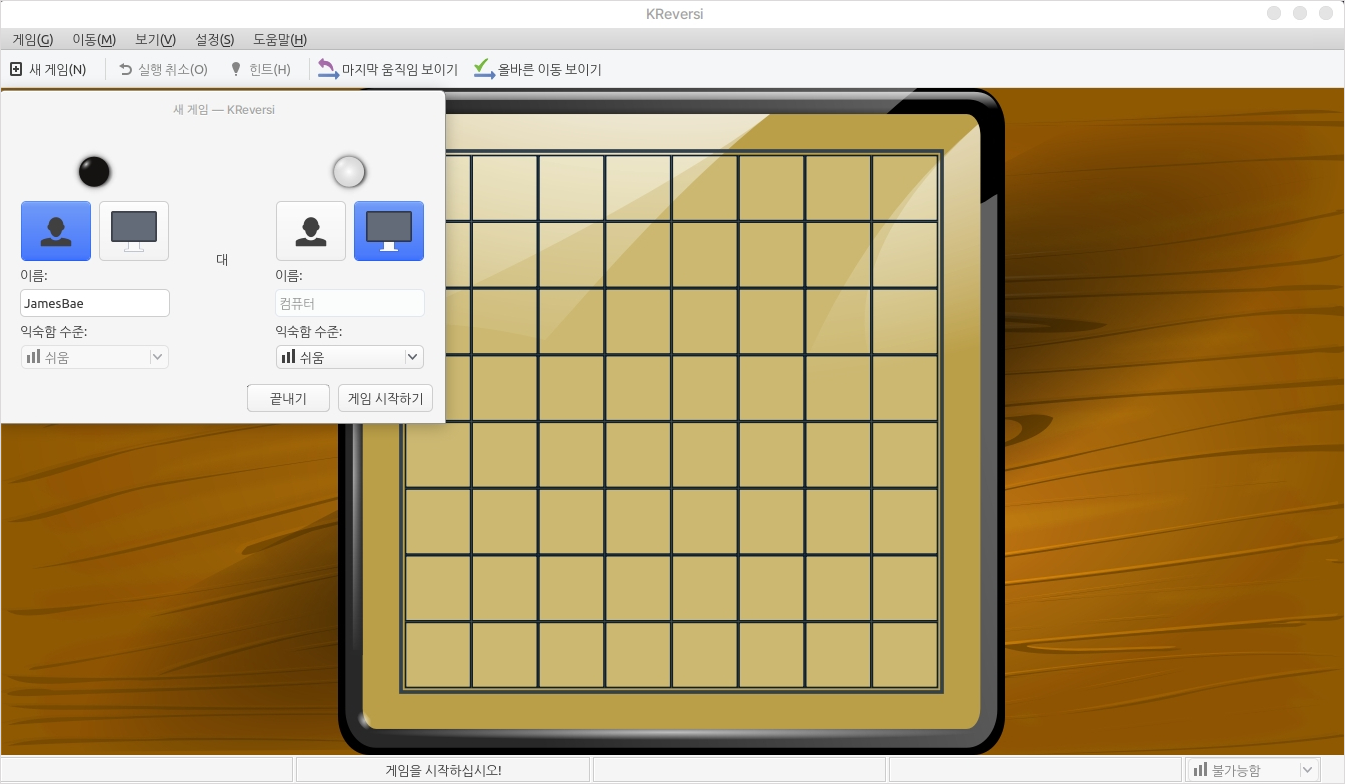 사람과 컴퓨터를 지정하고 난이도를 설정하여 시작합니다.