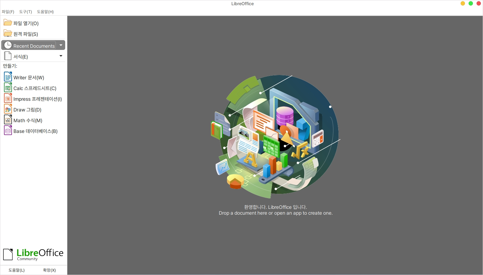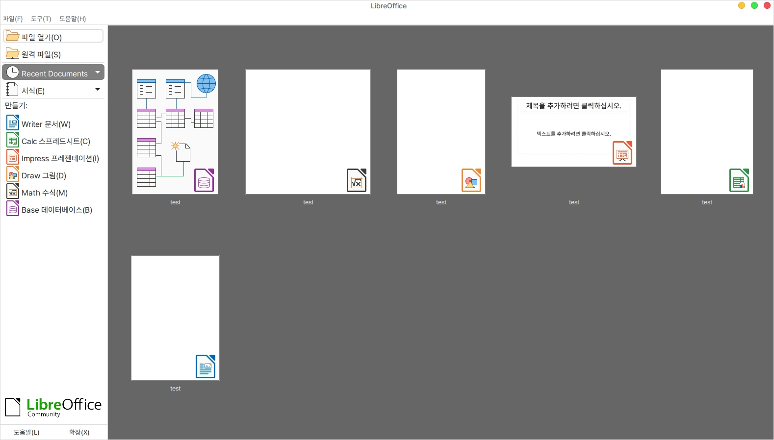 만약 실행한 문서가 있다면 다음과 같이 리브레 오피스와 관련된 모든 서식의 파일을 통합적으로 확인, 관리하실 수 있습니다.