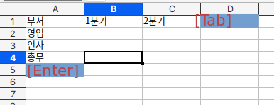 &#x20;      2\. Enter 또는 Tab 키를 눌러 다음 셀로 이동합니다.