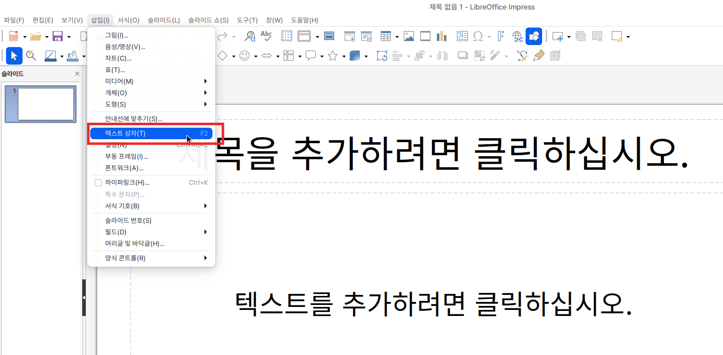 슬라이드에 텍스트를 추가하려면, 미리 작성된 서식 파일 상자를 선택하거나 삽입 > 텍스트 상자를 선택하세요.