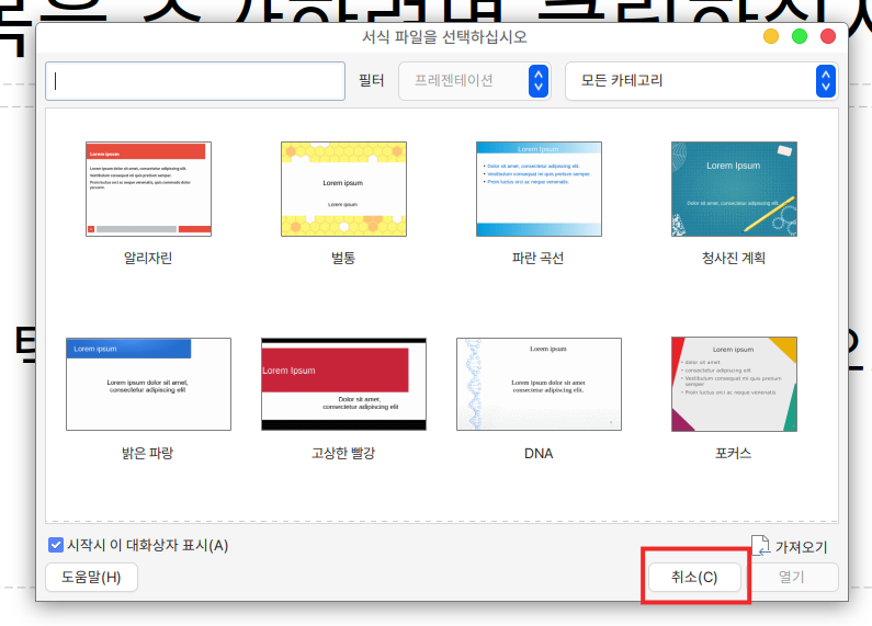 * 빈 프레젠테이션을 생성하고 싶으면 서식 팝업창에서 \[취소]를 선택하세요.