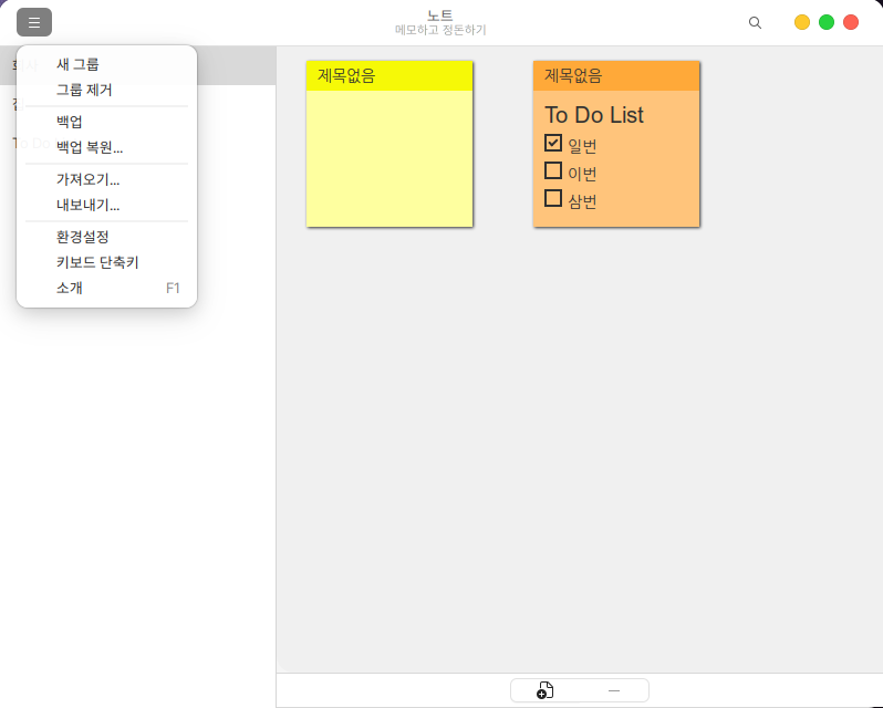 우측 상단의 ![](https://4090665885-files.gitbook.io/~/files/v0/b/gitbook-x-prod.appspot.com/o/spaces%2FBKrxTTaACEPEgr0BkulL%2Fuploads%2FHC7z9y6n8OuunElVX47X%2F%EC%8A%A4%ED%81%AC%EB%A6%B0%EC%83%B7%2C%202022-11-16%2018-42-01.png?alt=media\&token=9dc1abe0-af17-43a1-b21b-e7d48d0900b1)아이콘을 클릭하면 새 그룹 생성 및 백업 등 여러 기능을 사용할 수 있고, 하단의 ![](https://4090665885-files.gitbook.io/~/files/v0/b/gitbook-x-prod.appspot.com/o/spaces%2FBKrxTTaACEPEgr0BkulL%2Fuploads%2FN6KfOL0tJPeGln6ARxTb%2F%EC%8A%A4%ED%81%AC%EB%A6%B0%EC%83%B7%2C%202022-11-16%2018-51-37.png?alt=media\&token=6cef9f97-45a9-4229-9313-e5274e771893)아이콘을 통해 각각의 그룹마다 노트를 추가하거나 제거할 수 있습니다.&#x20;