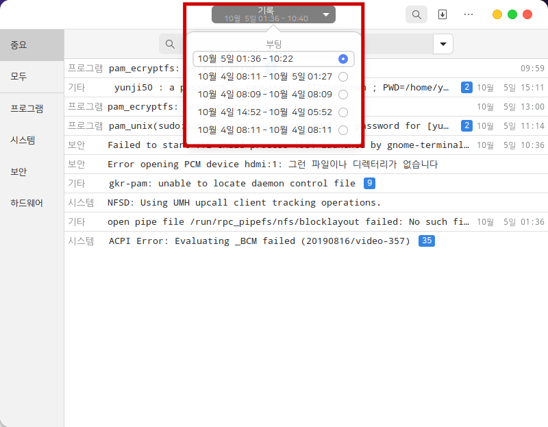 터미널에서 gnome-logs를 입력하면 프로그램을 실행할 수 있습니다.&#x20;