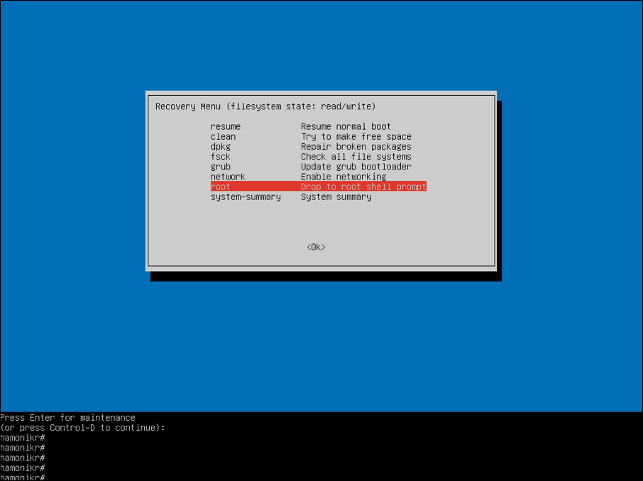 **두번 째를 선택해야 recovery mode 로 진입합니다.**