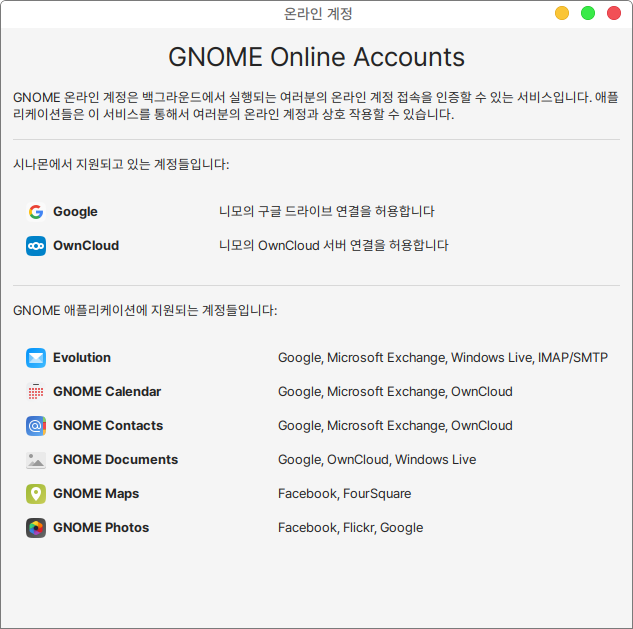 화면 상단의 GNOME온라인 계정 정보 소개를 클릭하면 도움말 확인이 가능합니다.&#x20;