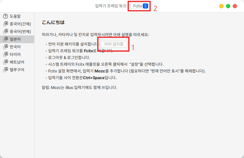 2\. 언어 지원 패키지를 설치하고 입력기 프레임 워크를 Fcitx로 바꿔준 후, 로그아웃 로그인합니다.