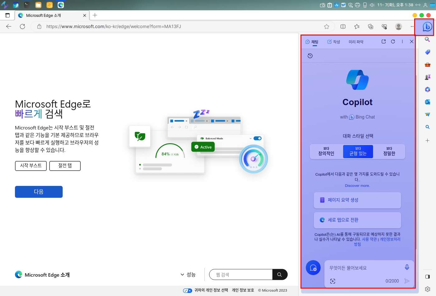 채팅, 작성, 미리파악 메뉴을 선택해 Bing AI와 채팅으로 사용하실 수 있습니다.