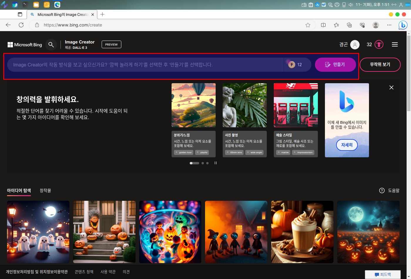 Bing AI을 이용한 이미지를 생성을 위해 "https://www.bing.com/create" 접속합니다.