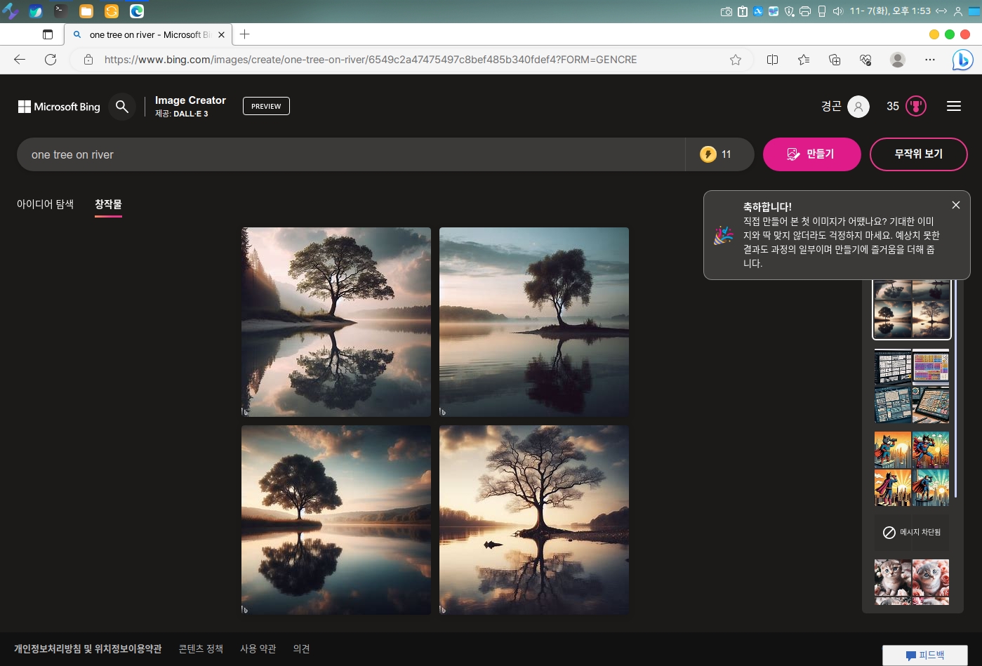 원하시는 이미지를 텍스트로 입력을 하시고 "만들기" 버튼을 클릭합니다.