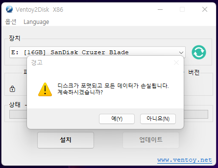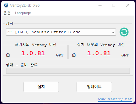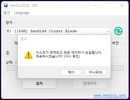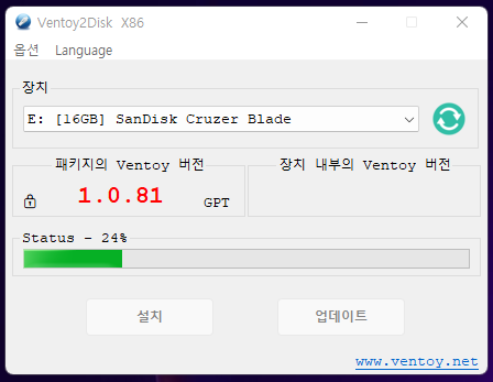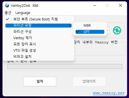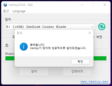 아래 이미지의 우측에 장치 내부의 Ventoy 버전 항목이 표시된다면 정상적으로 설치된 것입니다.