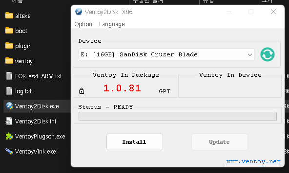 Ventoy를 다운로드 받고 압축을 풀고 Ventoy2Disk.exe를 실행하면 다음과 같은 창이 나옵니다.