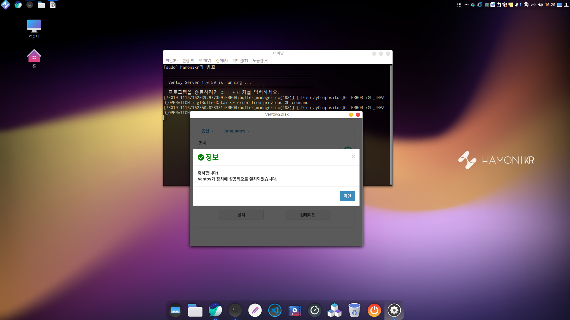 설치가 완료되면 다음과 같이 완료 메세지가 나오고 확인을 누른 후 Ventoy 프로그램을 종료 합니다.
