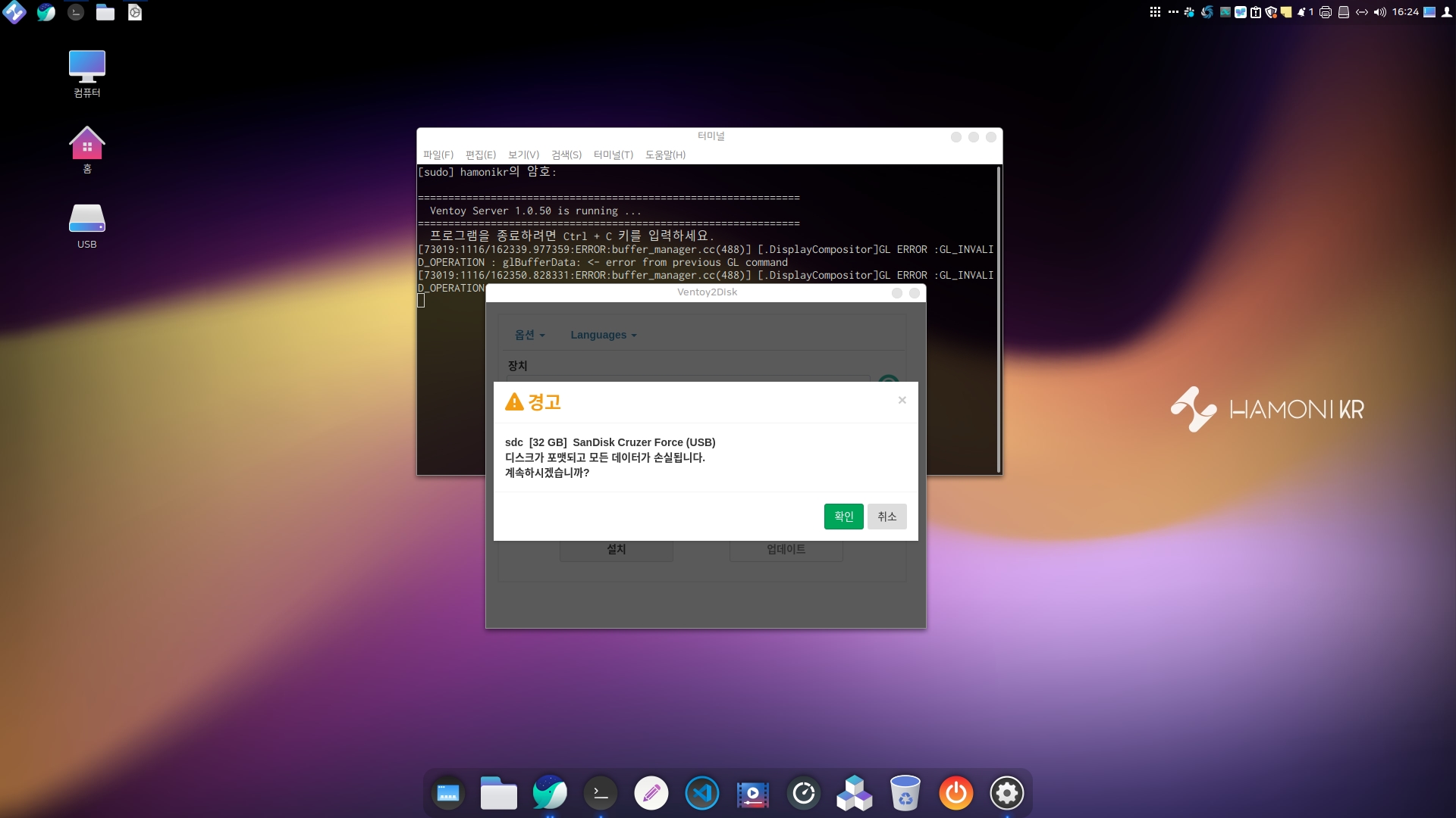 설치 버튼을 누르면 다음과 같이 USB가 초기화 된다는 경고 메세지가 나오게 되는데 확인을 눌러 주시면 됩니다.