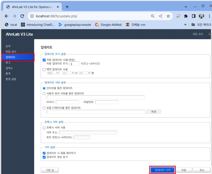 Ahnlab-v3lite 실행 화면에서 좌측 메뉴 중 "업데이트" 항목을 클릭하신 후 페이지 하단의 "업데이트 시작" 버튼을 클릭하여 Ahnlab-v3lite 최신버전으로 업데이트를 진행합니다.