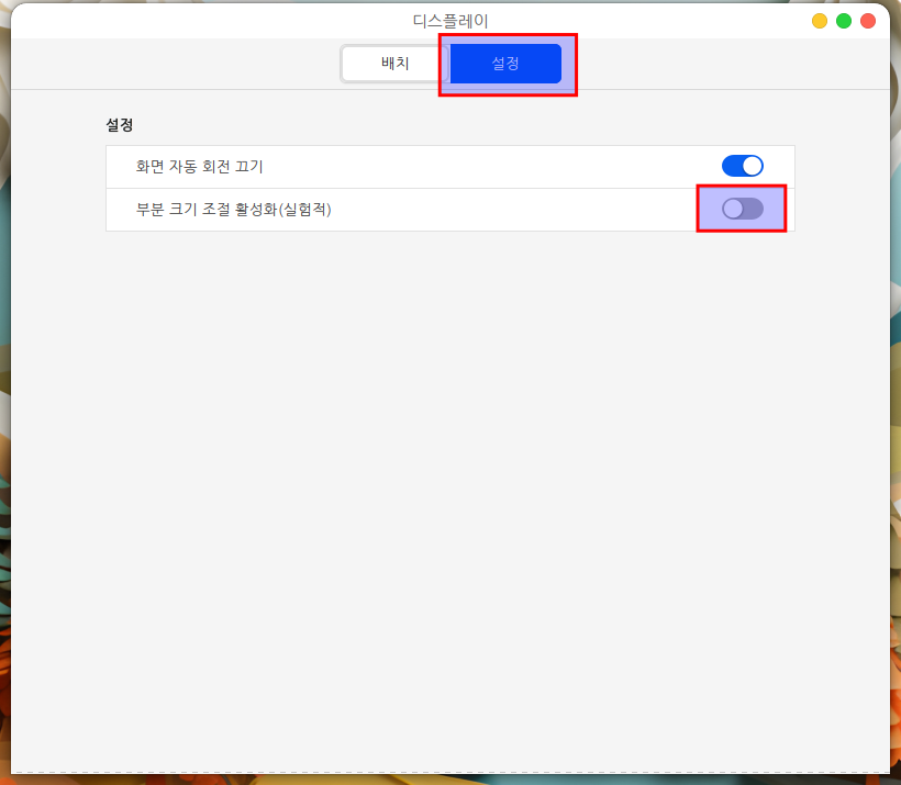 * 디스플리에 설정창에서 "설정" 탭을 클릭하고, "부분 크기 조절 활성화(실험적)"을 선택해서 활성화합니다.