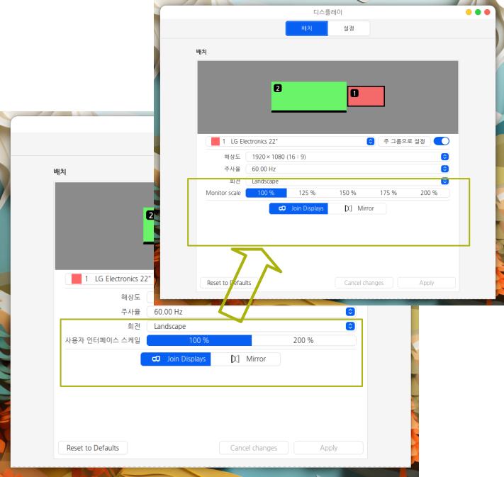 * "Monitor Scale" 또는 "스케일" 옵션에서 원하는 스케일을 선택합니다.&#x20;