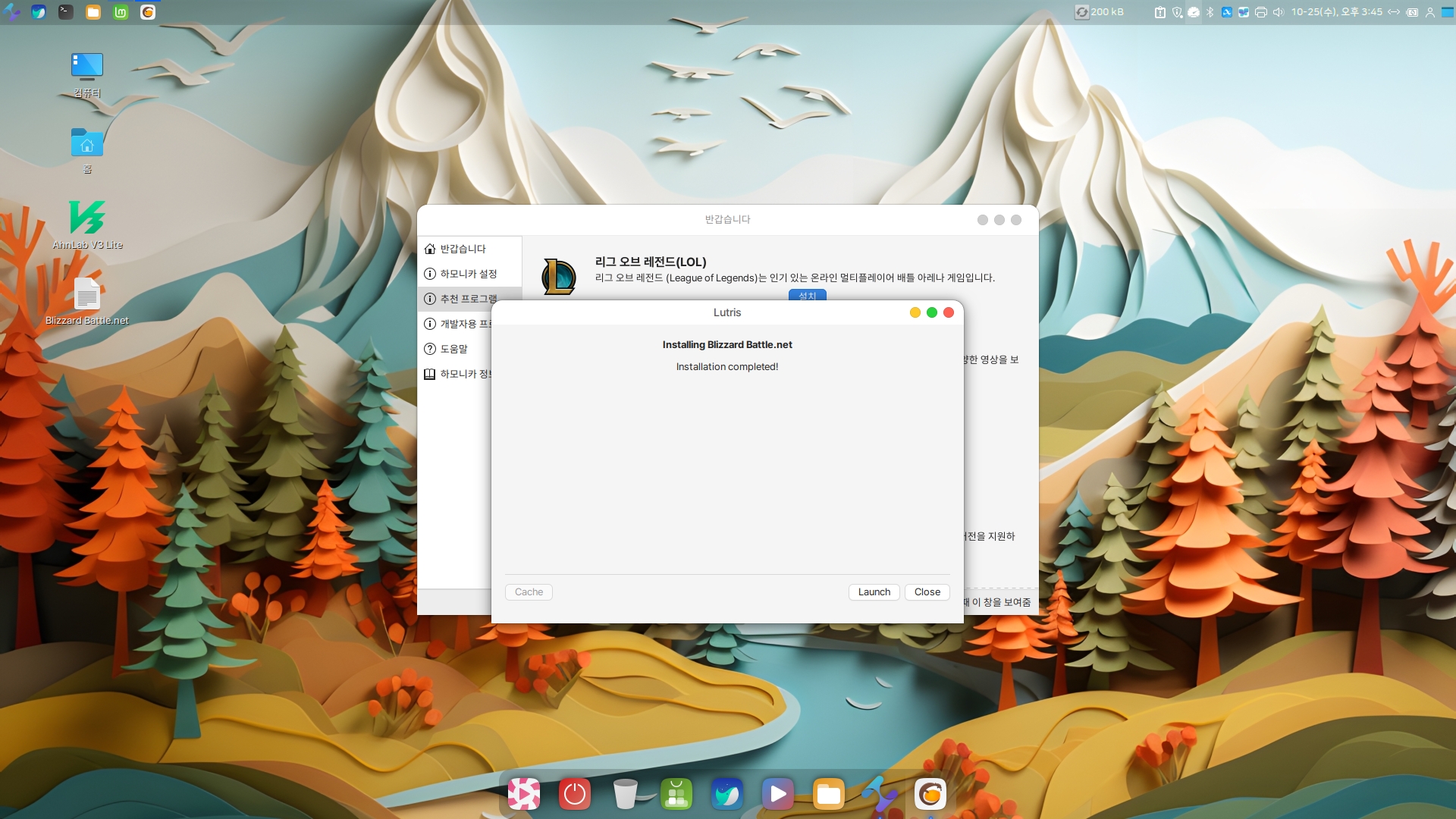 Lutris에 블리자드 배틀넷 설치가 완료되었으며, Lutirs 창을 닫습니다.