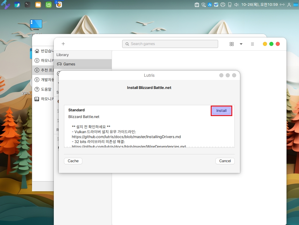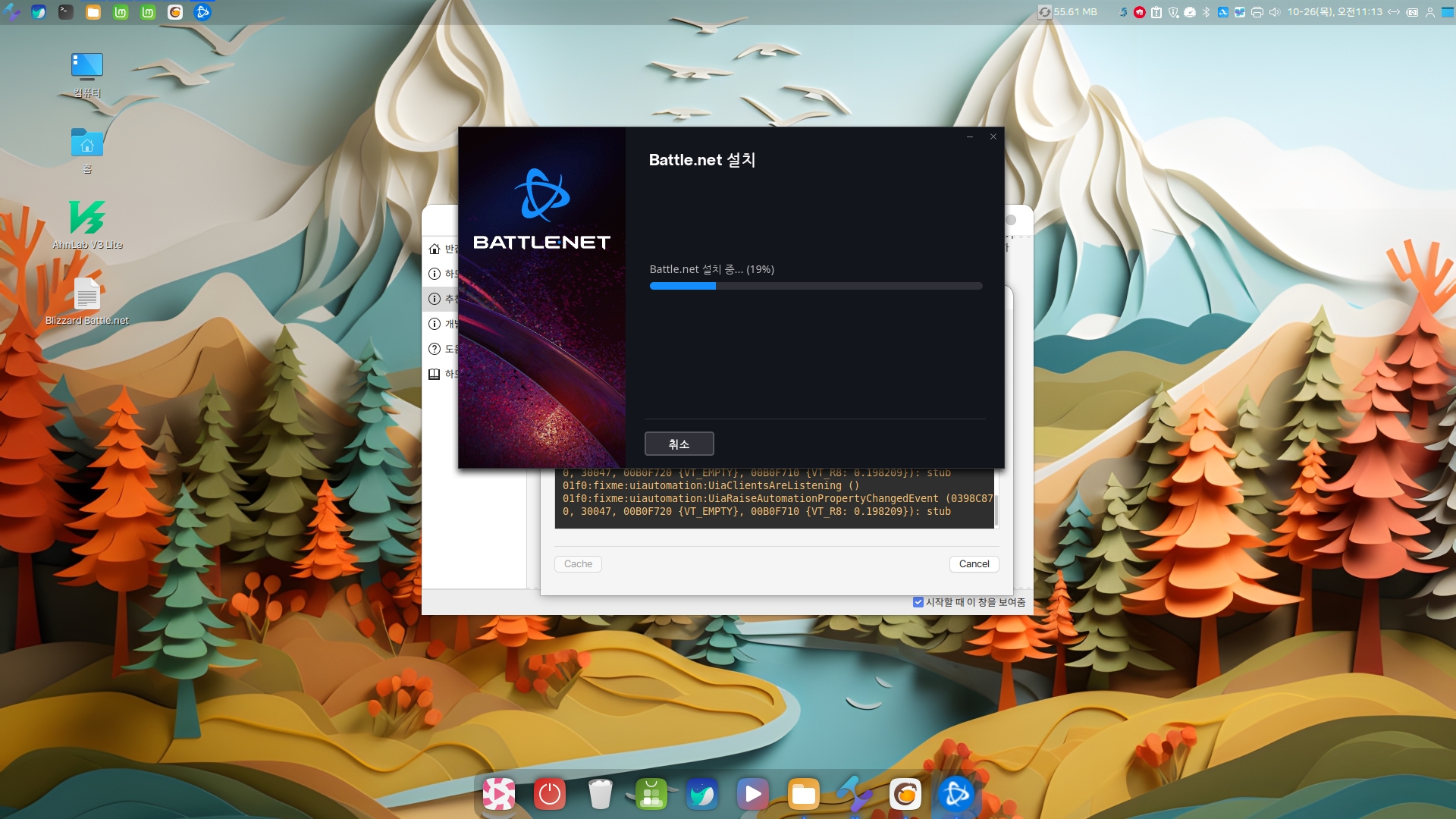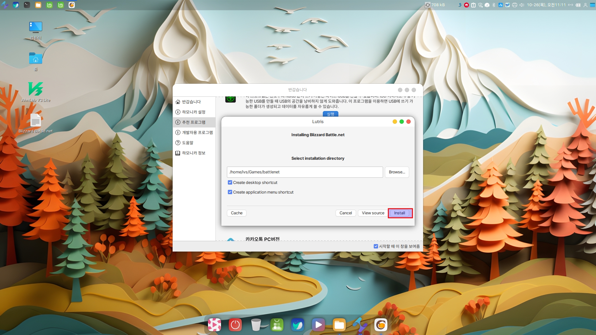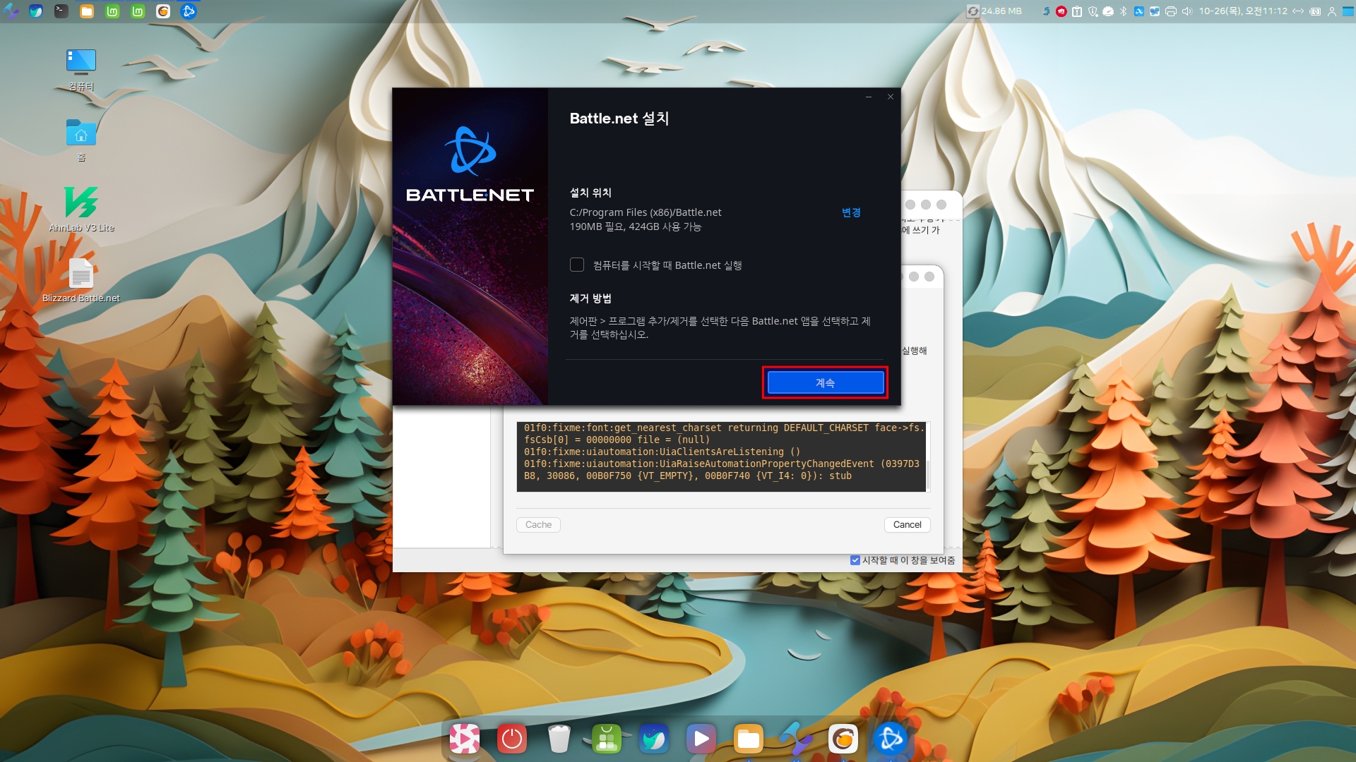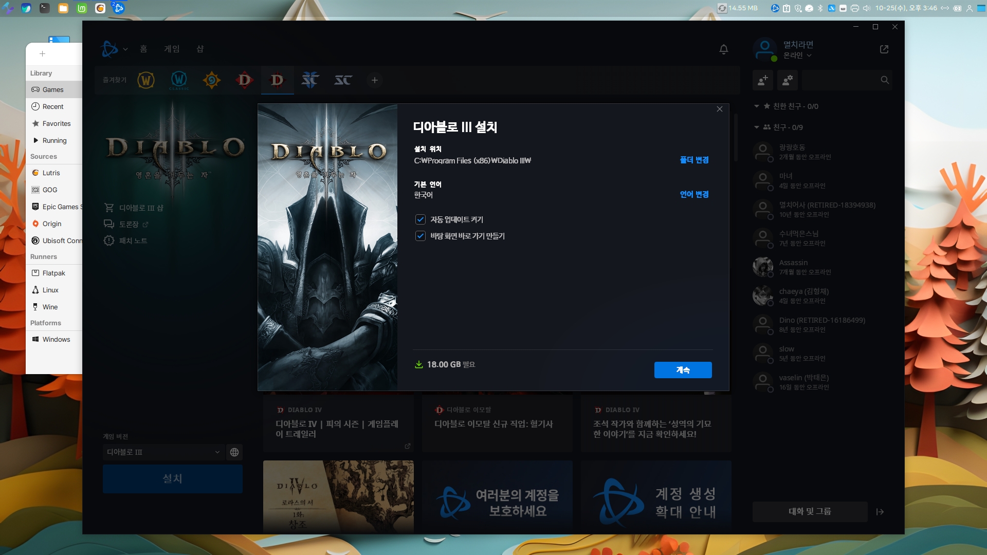 Lutris에 블리자드 배틀넷 설치가 진행되며,