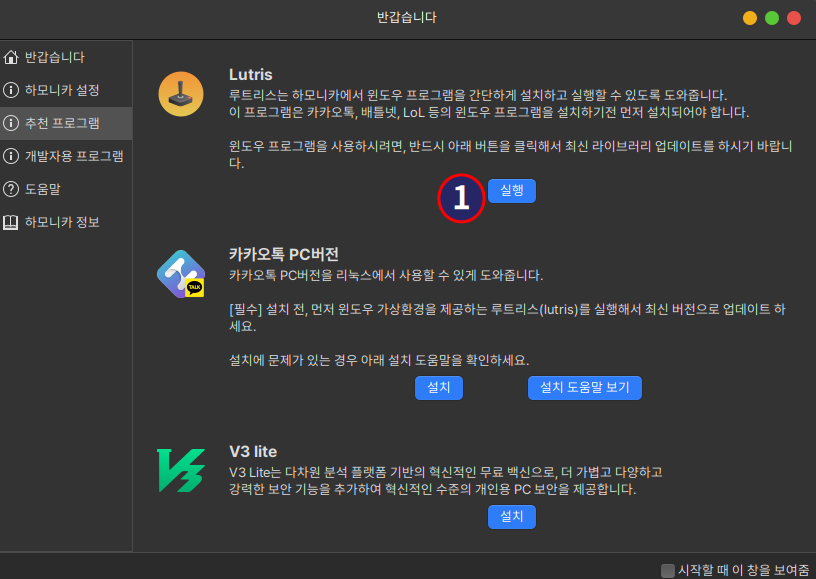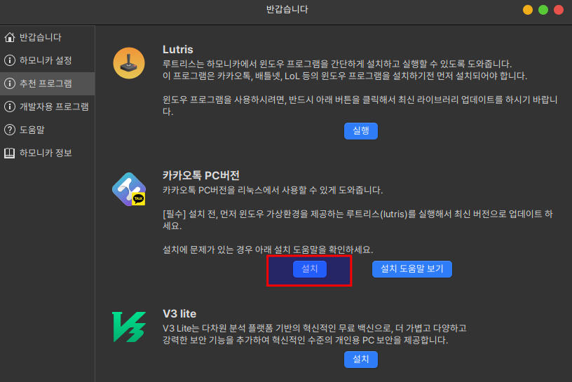 하모니카 OS 에서는 카카오톡과 같은 윈도우 전용 프로그램을 쉽게 설치할 수 있도록 "메뉴 > 반갑습니다" 프로그램에서 다음과 같이 지원하고 있습니다.