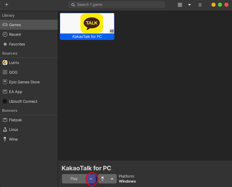 카카오톡 설치를 마친 후, 메뉴 > lutris 를 실행하면 다음과 같이 설치된 카카오톡이 보입니다.