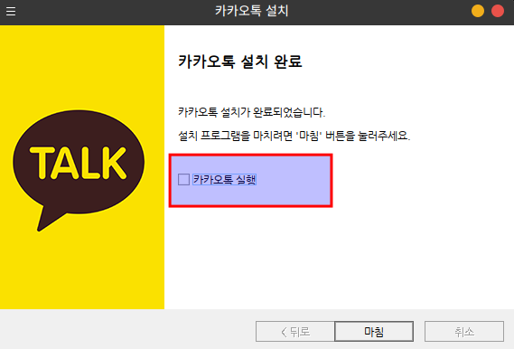 마지막 단계에서 다음과 같이 카카오톡을 바로 실행하지 말고, 체크 박스를 해제하세요.