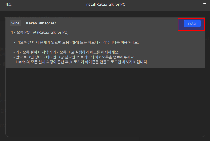 2. Lutris 가 실행되고 최신 라이브러리 업데이트가 완료되면 "카카오톡 PC버전" 아래의 설치 버튼을 클릭합니다.