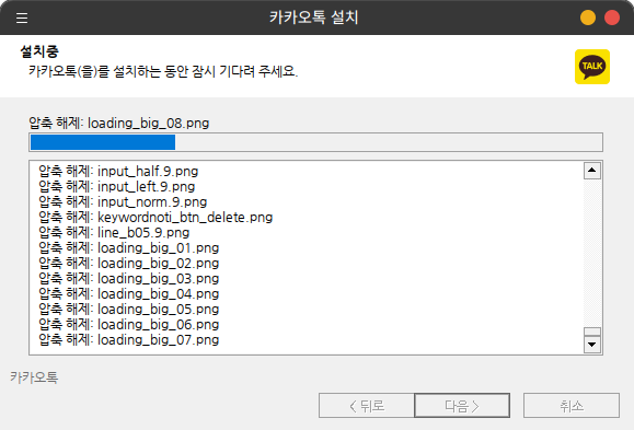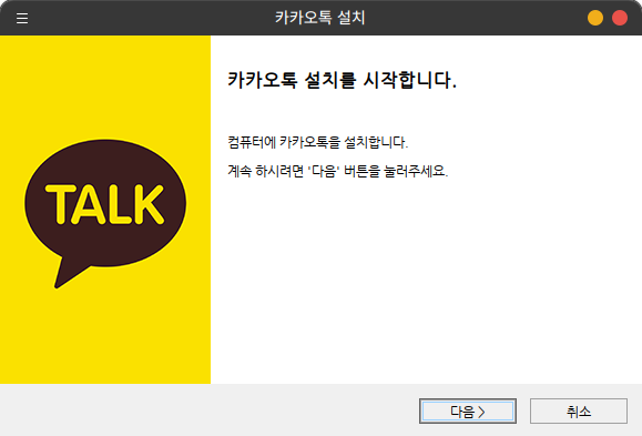 가상환경 설정이 완료되면 잠시 후 카카오톡 설치가 시작됩니다. 윈도우의 카카오톡 설치와 동일하게 진행합니다.
