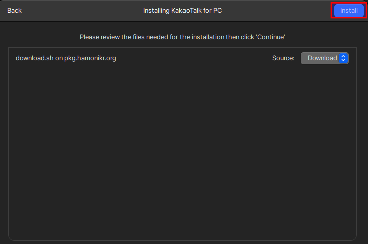 다음은 카카오톡 설치파일을 다운로드 받는 단계입니다. 우측상단의 Install 버튼을 클릭하세요.