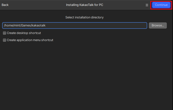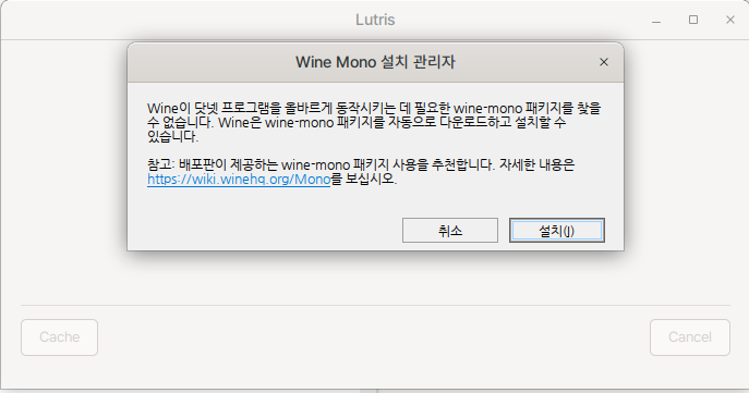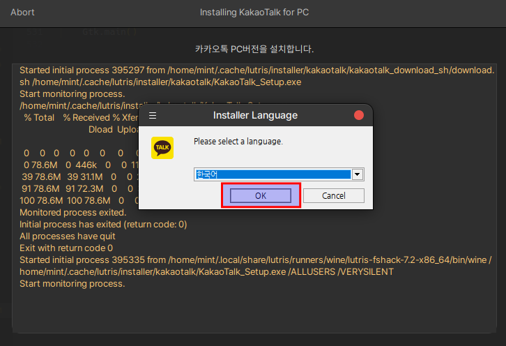 이 단계는 윈도우 가상환경이 설정을 완료하기 위해서 반드시 필요합니다. 만약 여기서 실행을 하면 카카오톡이 바로 실행되고 가상환경 설정도구 Lutris 에서는 설치가 완료되지 않습니다.