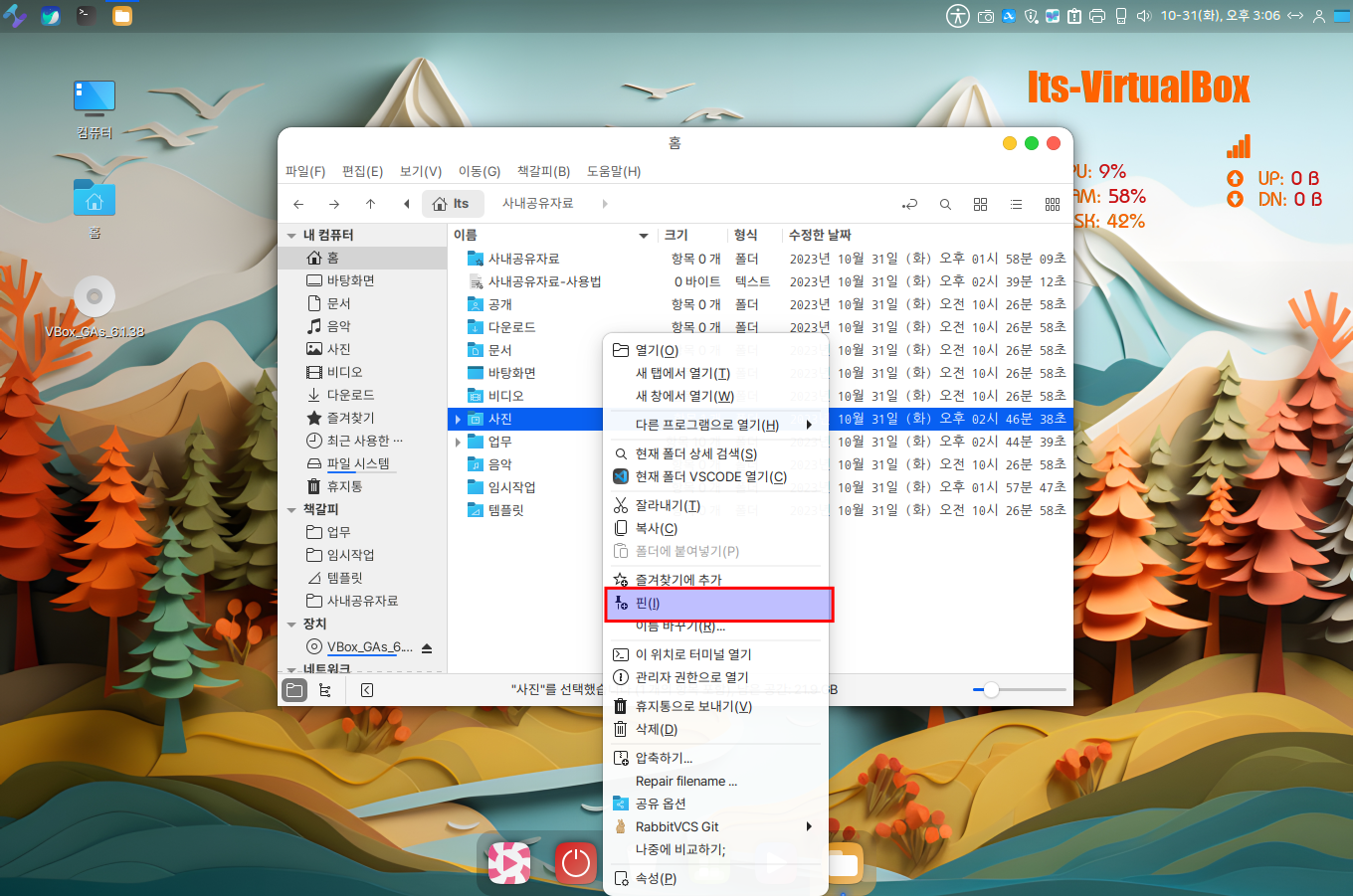 자주 사용하는 폴더나 파일에서 마우스 우측 버튼을 클릭하고 "핀"을 선택합니다.&#x20;