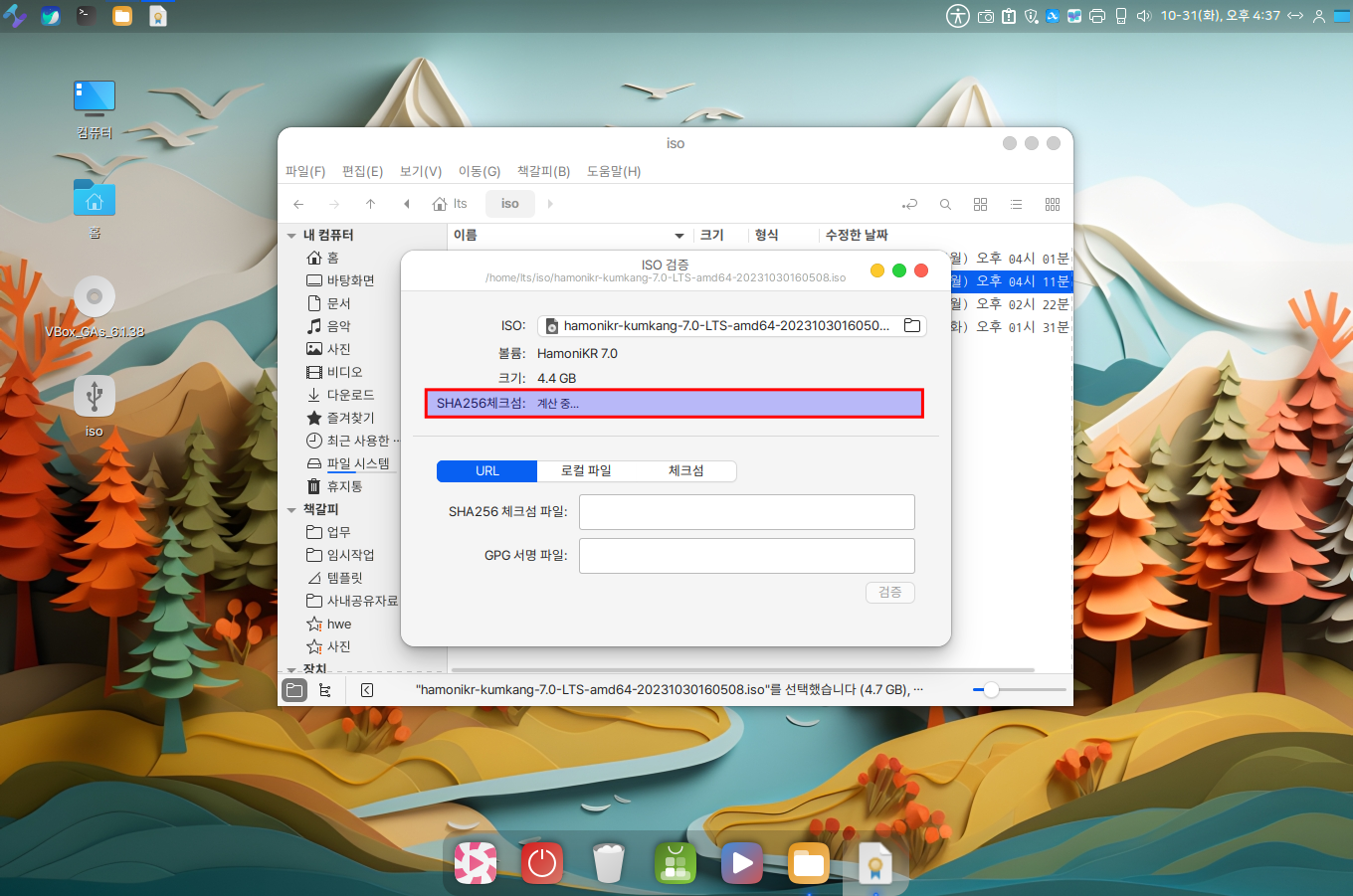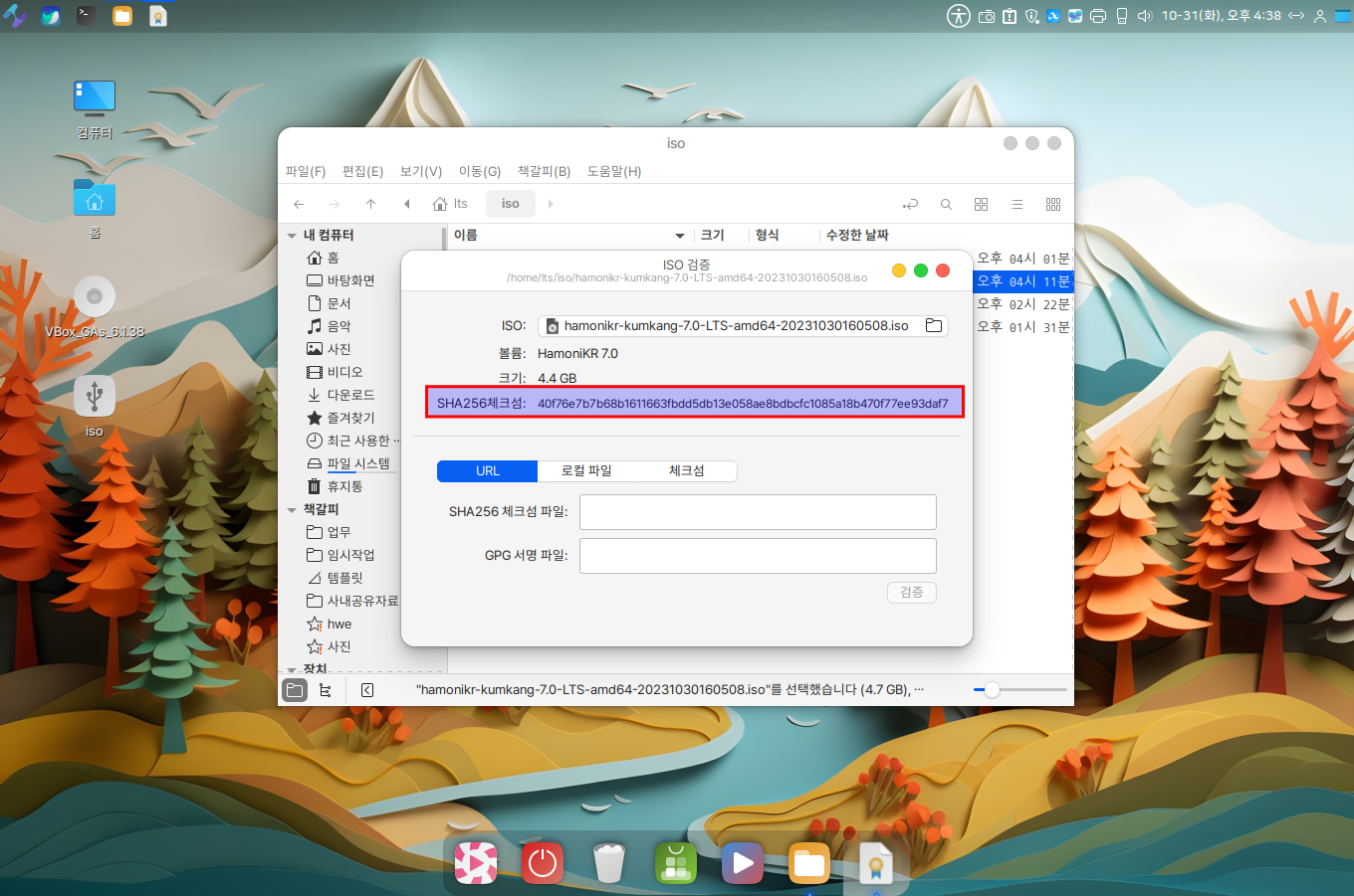 파일 체크섬을 하는 방법은 터미널에서 명령어로 확인을 할 수 있지만 HamoniKR OS에서는 파일 탐색기에서 파일 체크섬을 할 수 있는 기능을 제공하고 있습니다.