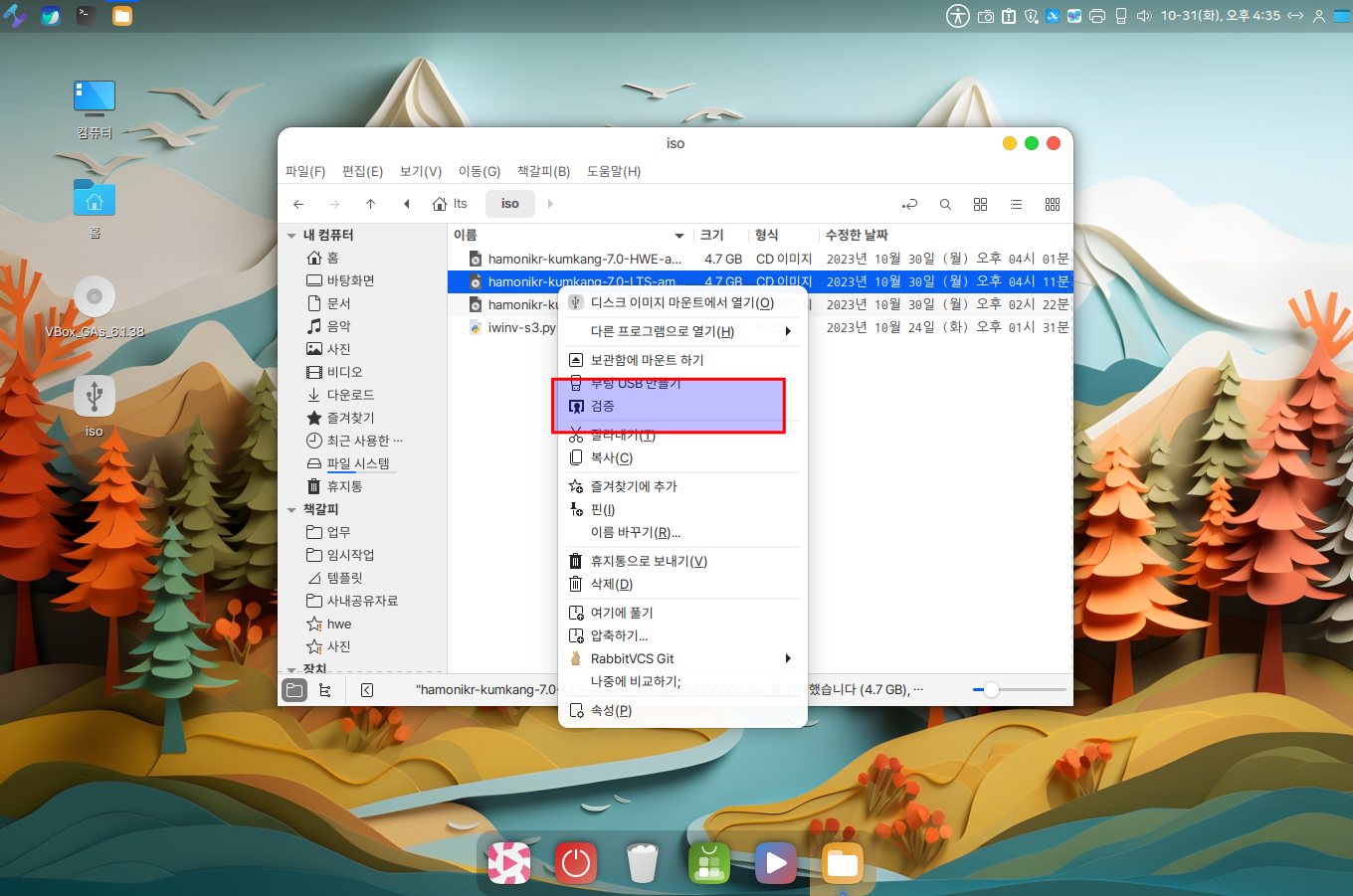 iso 파일에서 마우스 우측 버튼을 클릭하고, "검증"을 선택합니다.