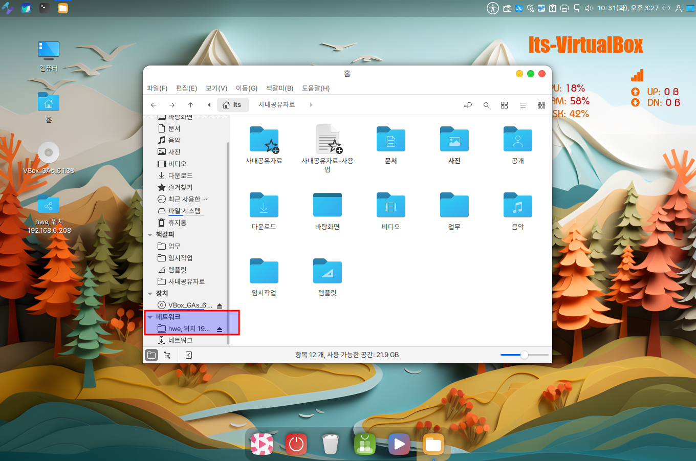 "서버에 연결하기" 기능이 완료되면 아래 화면과 같이 좌측 패널 하단에서 "네트워크" 메뉴에 추가된것을 확인하실 수 있습니다.&#x20;