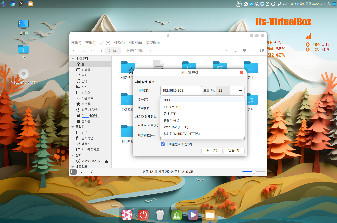 * 종류 : SSH, FTP(로그인), 공개FTP, 윈도우 공유, WebDAV(HTTP), 보안된 WebDAV(HTTPS)
