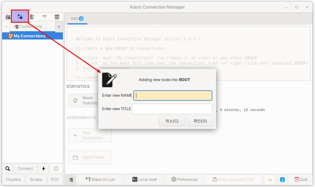 Asbru-cm의 좌측 상단위 "Add a new connection" 아이콘을 클릭을 하신 후 "Enter new Name" 입력란에 연결하실 SSH의 정보를 입력을 하고 "확인" 버튼을 클릭합니다.