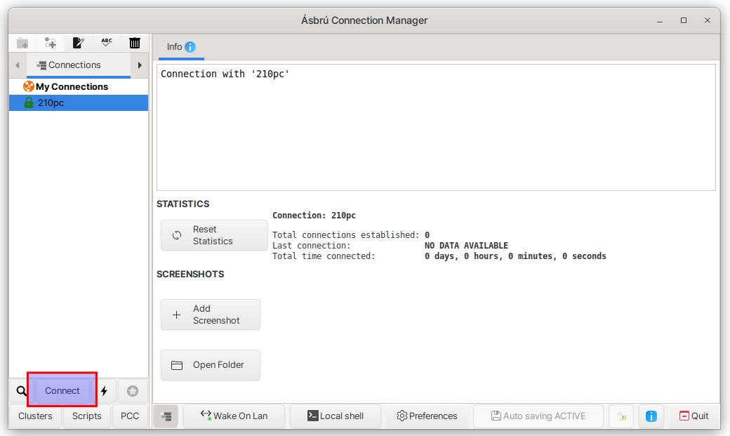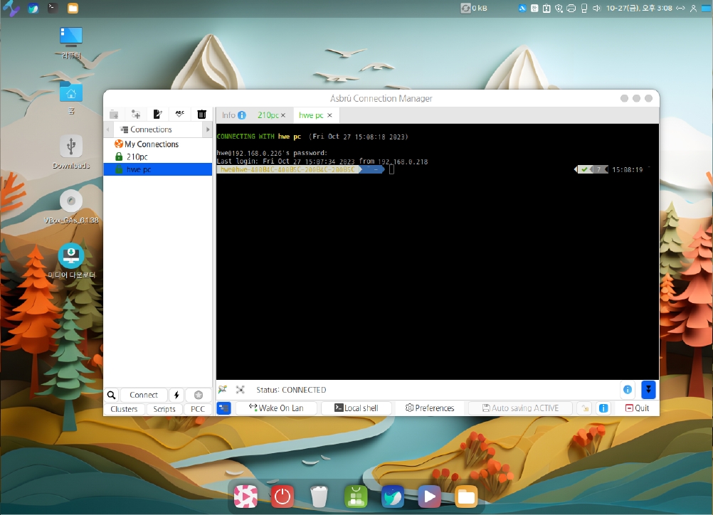 좌측 화면창에 연결된 SSH pc의 정보가 나열되며, 하단의 "Connection" 버튼을 클릭하시거나, 마우스 더블 클릭으로 연결하여 사용하실 수 있습니다.