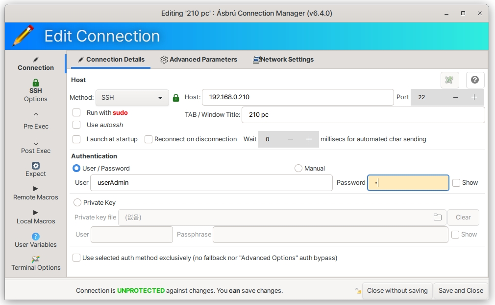 연결하실 PC의 SSH 정보를 입력 하신 후 "Save and Close" 버튼을 클릭합니다.