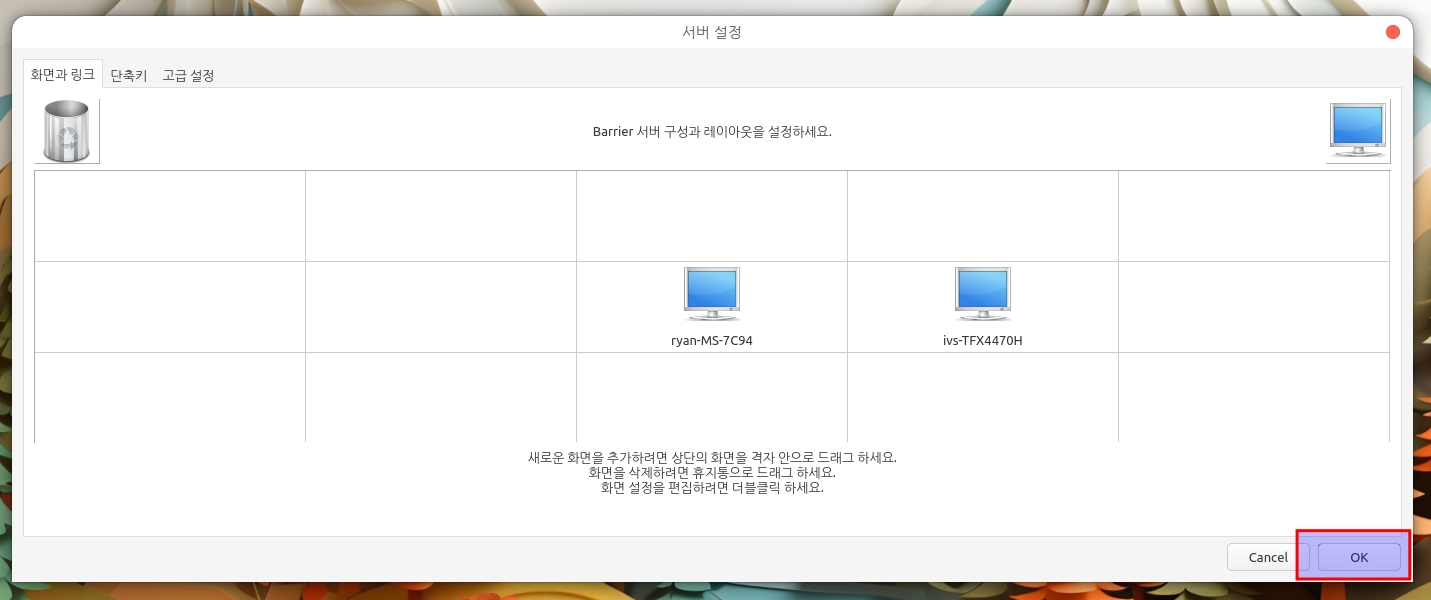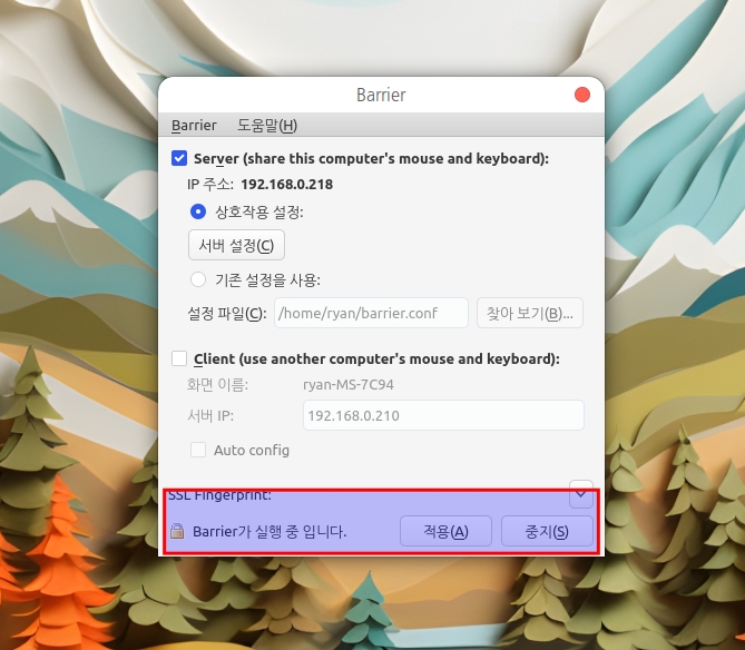 Barrier를 사용하기 위한 서버 설정이 완료된것이며, "OK" 버튼을 클릭하여 "서버설정" 창을 닫으시고 Barrier의 "시작" 버튼을 클릭합니다.