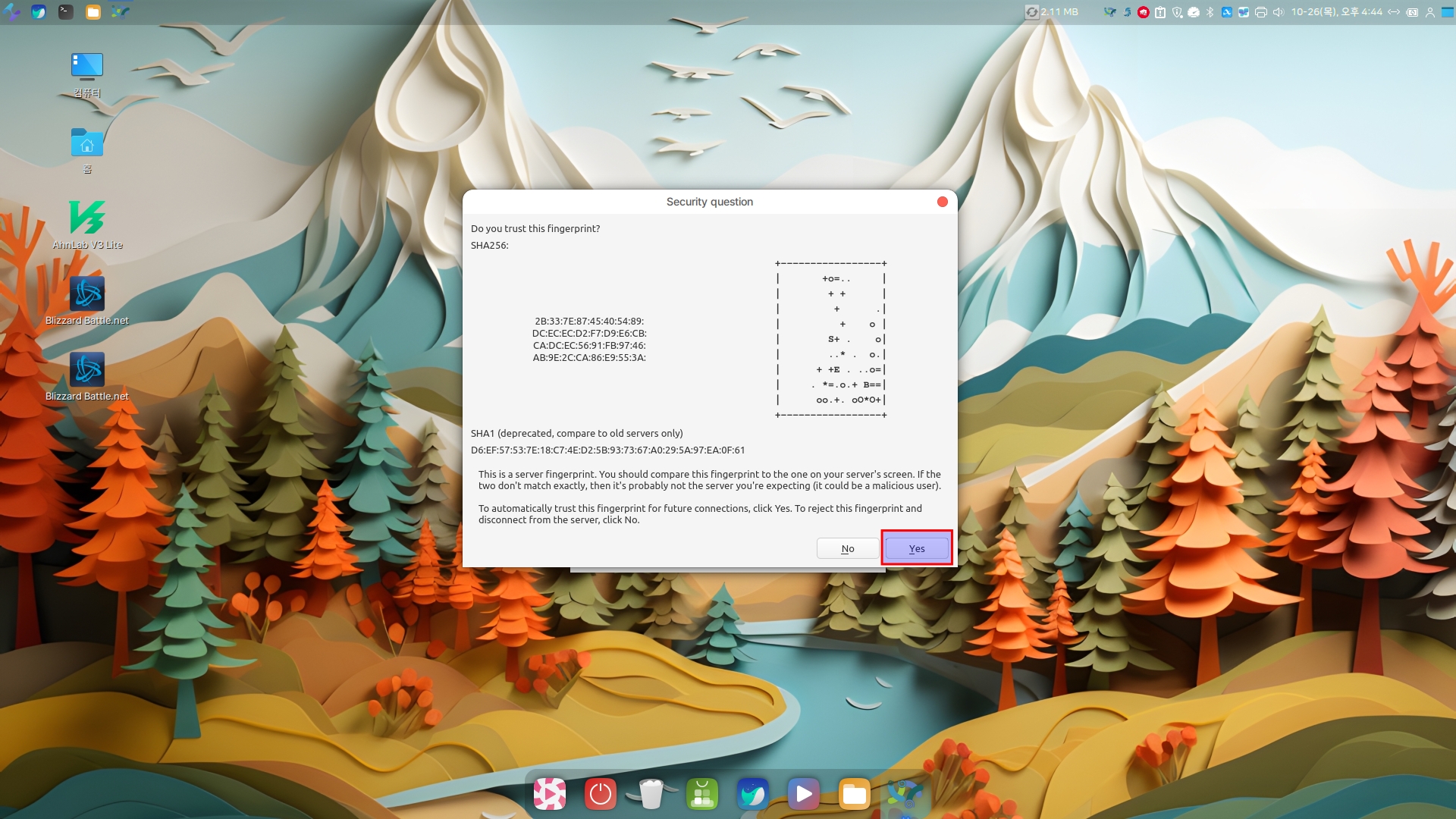 Security question 창이 나오는데 여기에서 "Yes" 버튼을 클릭합니다.